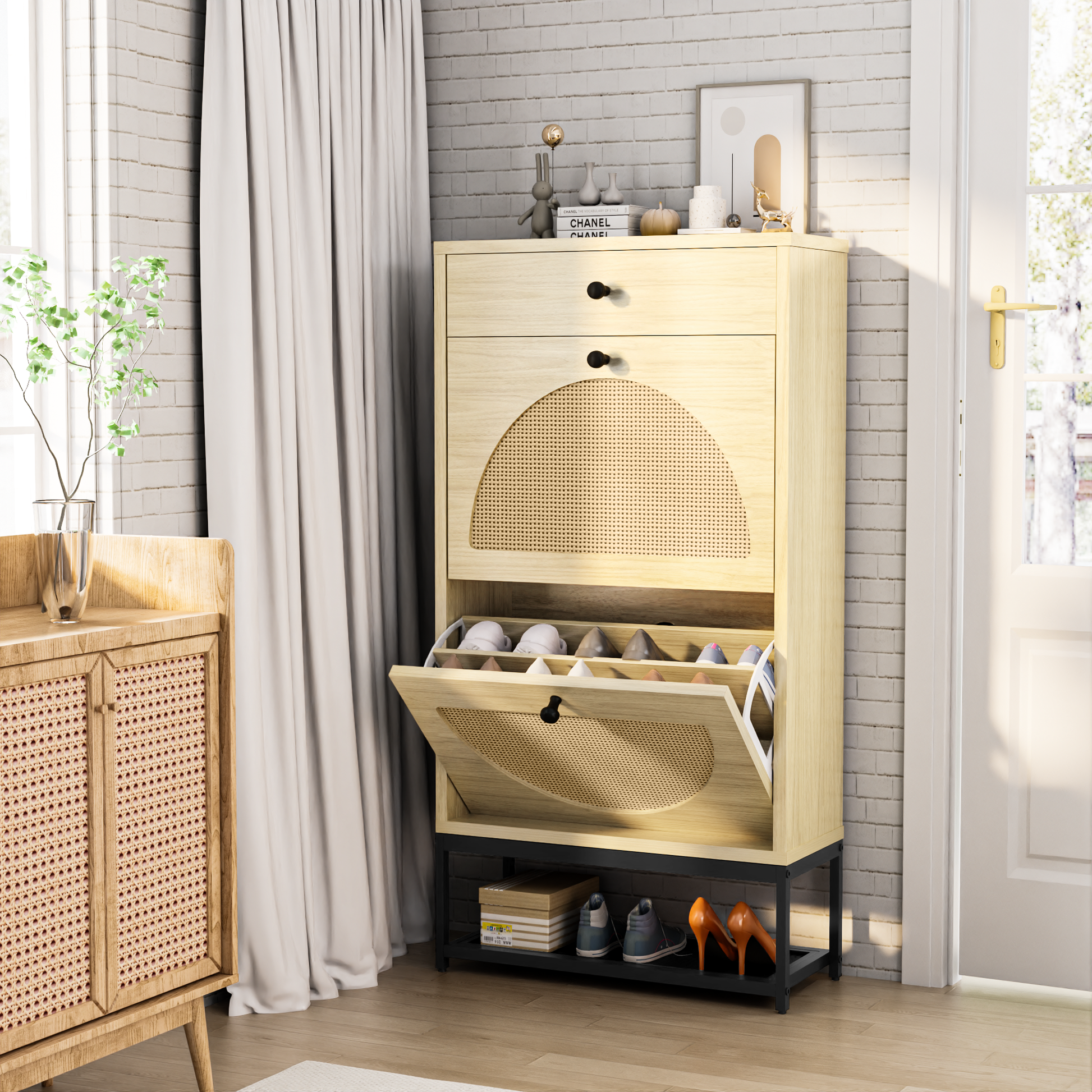 Furlinkhm Natural Rattan Shoe Cabinet with 2 Flip Drawers and 1 Pull Drawer, Slim Shoe Storage Cabinet Entrance Hallway Free Standing Shoe Rack with Metal Frame for Sneaker, Sandal, Boot, Slipper